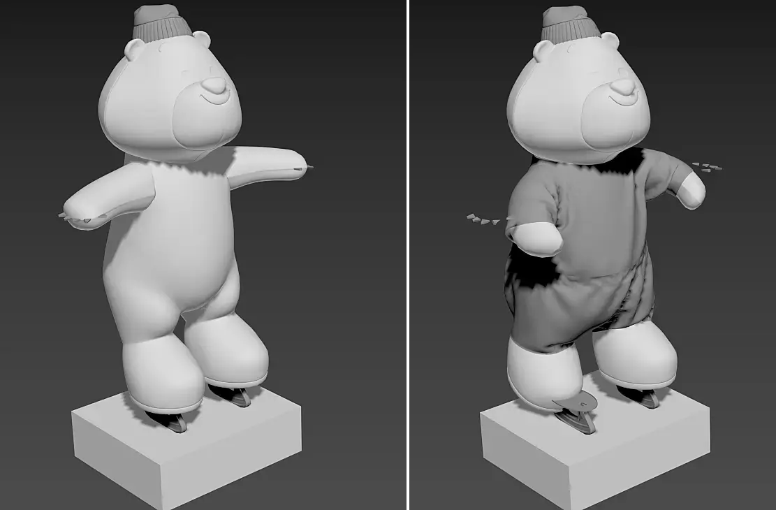 Благодаря анимированной форме проблем сшивания ткани в подмышечной области не возникает. Т.е. сначала симуляция проходит на статичной модели с расставленными в разные стороны руками, затем запускается покадровая симуляция где уже одетый медведь занимает исходное положение.