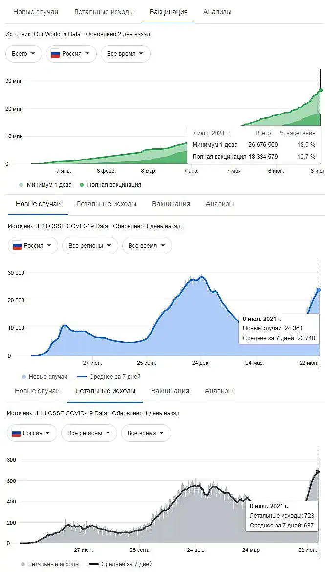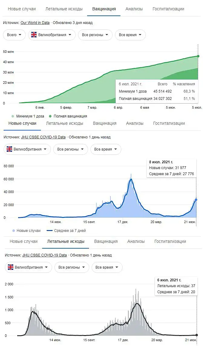 Разница по погибшим в Россия/Великобритания в 20 раз и все это прививка и потому что там подходят к минимальному порогу в 70% привитых. Причем заражений там больше, как в численном так и в процентном видах, чем в России.