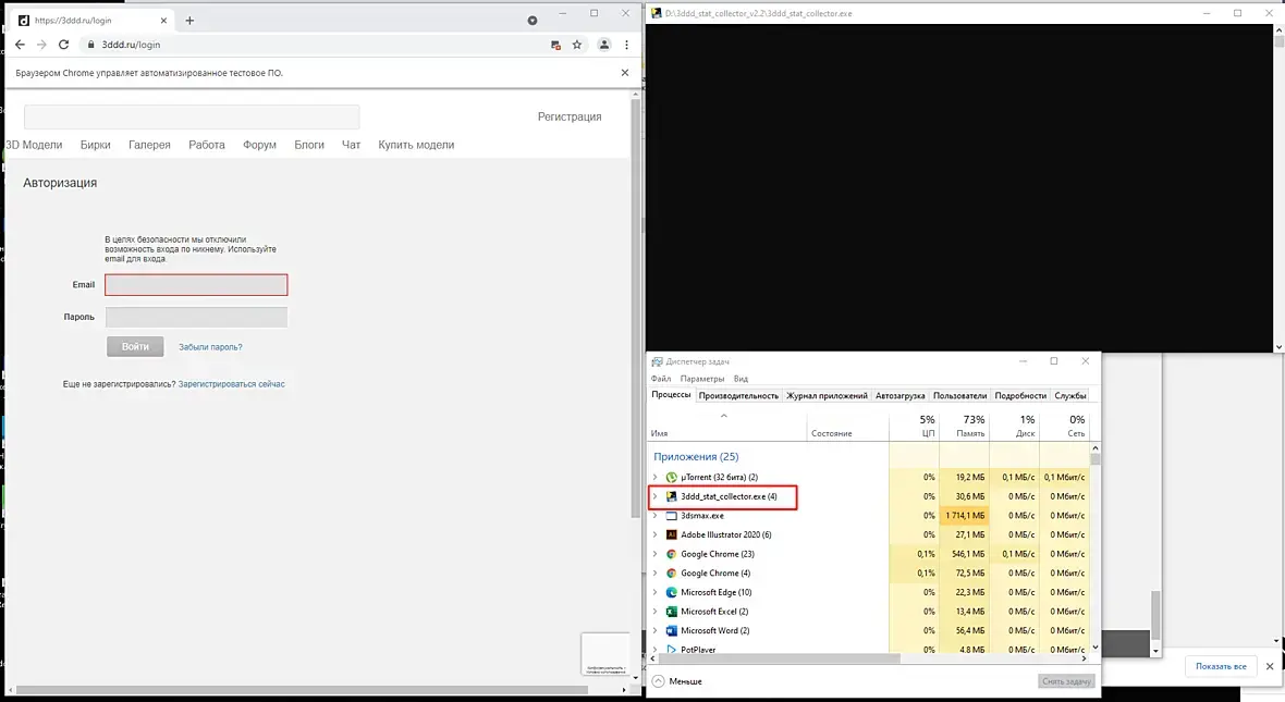 3. Узнать запущенна ли программа можно по новому открывшемуся окну браузера Chrome с приглашением залогиниться и пустым окном консоли windows рядом. Также в диспетчере задач, если скрипт запущен, будет виден соответствующий процесс 3ddd_stat_collector.exe (при закрытии окна консоли закроется и сам процесс со скриптом).