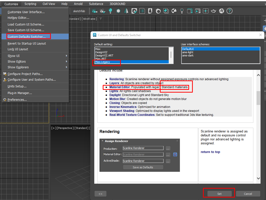 Приветствую. Знает ли кто, как сделать при загрузке Max`а scanline рендер по умолчанию, вместо Арнольда? Чтобы убрать материалы Арнольда и вернуть стандартные. Часто именно они нужны, а не Арнольдовские хрени. Да, можно после загрузки выбрать scanline, затем выбрать стандартный мат, но это неудобно, да и сами маты останутся от Арнольда, кроме того, который сам выберешь ручками и поменяешь на standart. А хочется что бы сразу как раньше...) Max 2024. Может, где то строчку в каком нибудь INI` прописать... В Интернете не нашел решения. На reddit`е был схожий вопрос, но не дали ответа, кроме как после загрузки поменять на scanline и бла бла...