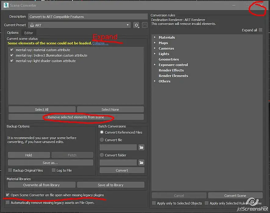 Нажать на синий подсвеченное Expand... и далее Remove selected element from scene и будет Вам счастье), если вы после этого откроете материал эдитор и возьмете пипеткой образец материала с добавленного вами объекта то в конце списка параметров материала будет отсутствовать свито Mentalrey и сообщение в нем о неивестных параметрах в нем.