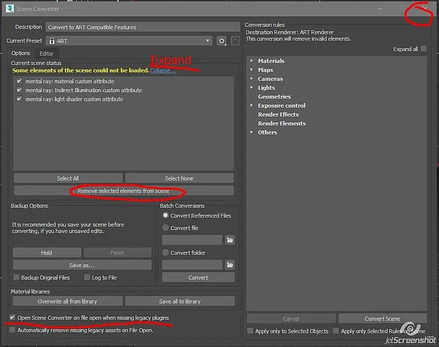 Если снимаем Open Scene, то при рендере вылизывает ошибки по материалам, мол не конвертирован.