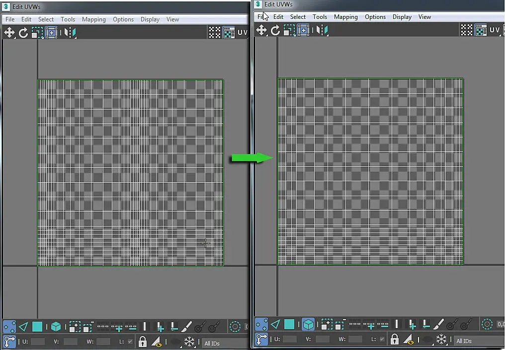 Тебе нужно либо больше точек добавить в градиент, либо развертку немного модифицировать в модификаторе Unwrap UVW. Я сделал так: развертку после лофта (слева) разбил пополам, и наложил куски друг на друга(можно еще отзеркалить), И растянул оба куска на всю рабочую область (на весь серый квадрат). Получилось, что на семечке с обоих сторон одинаковый рисунок.