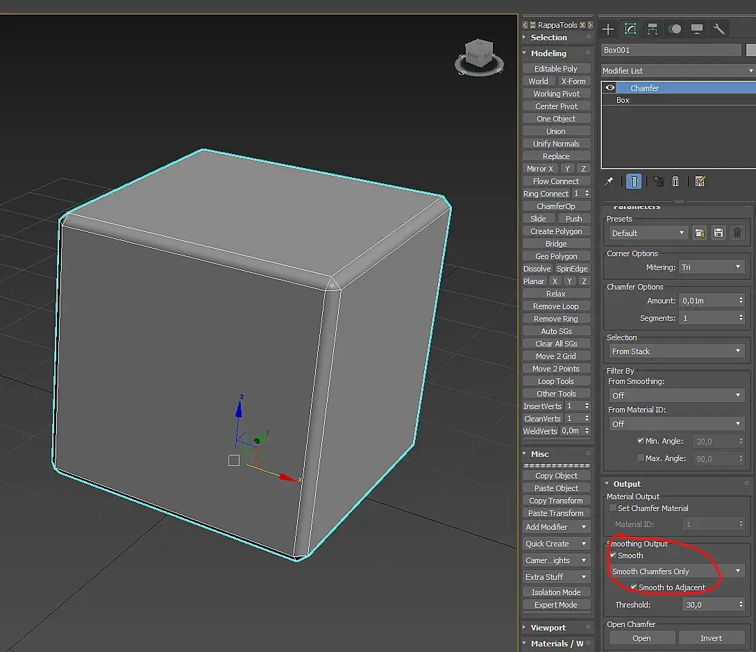Chamfer с 4 сегментами. Группа сглаживания создается автоматически (добавляются все полики в одну группу).