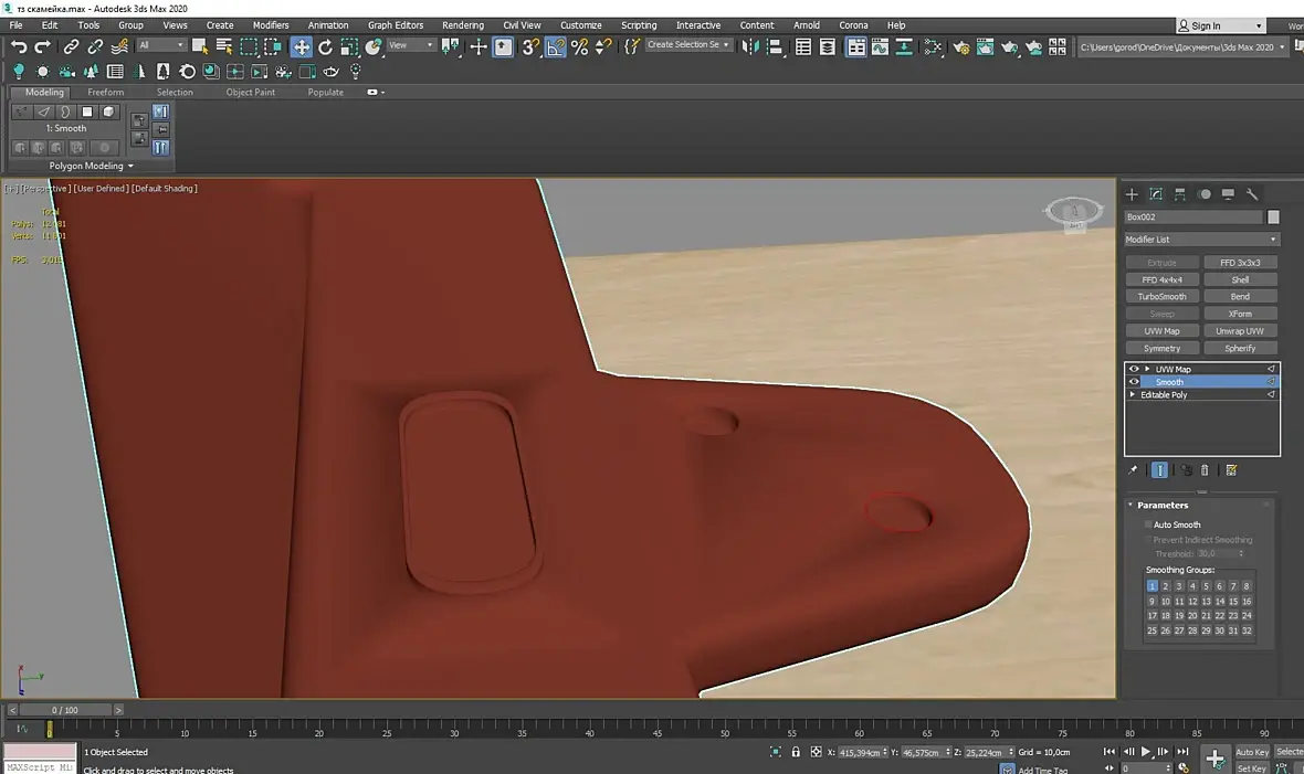 PaulKorenchuk Такое чувство буд то точка на заломе ушла вниз с общей плоскости. Выделите точку, нажмите релакс. Можно еще ребра по кругу и нажать альт+2