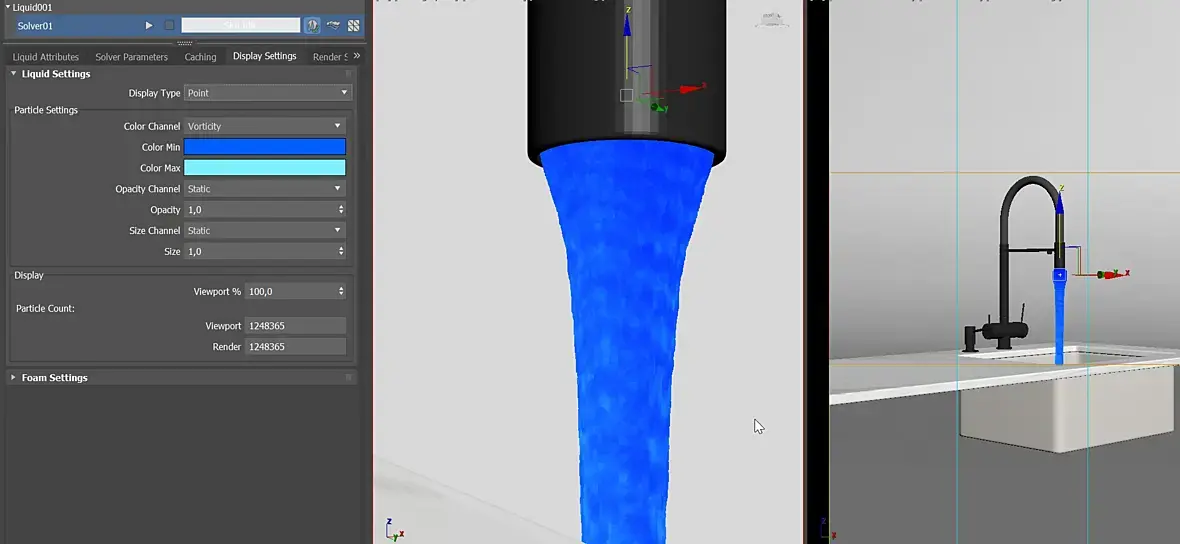Опять же, если это фонтан, или хотя бы душ, то анимацию конечно стоит симулировать. А вот из крана можно заанимировать текстуру нойза. Он и в жизни, если снять на камеру, будет не очень то и живым :-)