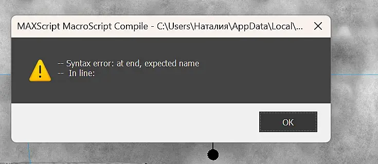 brick, в случае выше явно ругается на кастомный макрос, по синтаксису похоже на кнопку (я МаксСкрипт знаю очень поверхностно) для создания VRayDomeCamera. Опять же тело скрипта выглядит так ,как будто он недописан или изменен. Из-за этого и ошибка. Ну и ,еще шанс ,что не нравится кириллица в пути.