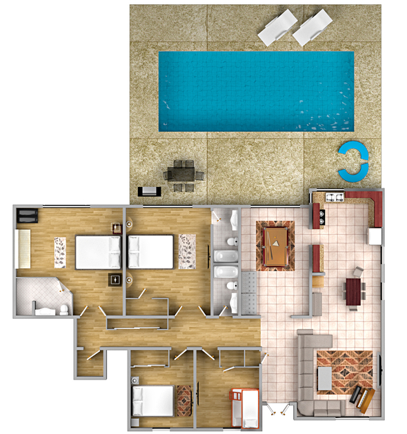 Ну это кому как удобнее. Я такие в фотошопе делал, просто рендерил предметы мебели сверху, а потом их и все текстуры раскладывал в фотошопе. Когда большой объём, это гораздо быстрее, чем моделить всё. Но можно конечно и в 3D собирать.