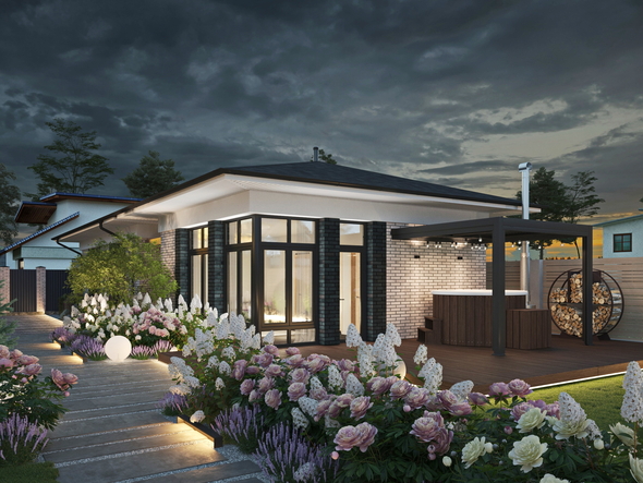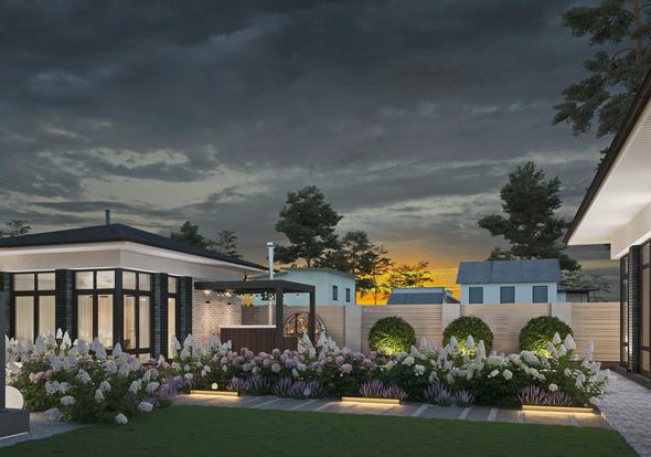 Участок 20*50 метров. Дом и гараж сделаны по фото и примерными размерами в плане. И баня сначала по одному проекту, потом по другому. Расстановка растений и материалов по тех.заданию. И несколько ночных рендеров. Картинки без всяких пост.обработок. Лишь в Айсидиси чуть высветлил, контраст, сочность и прочее добавил. Ну и коррективы потом.