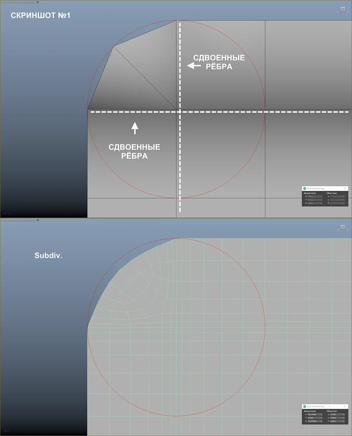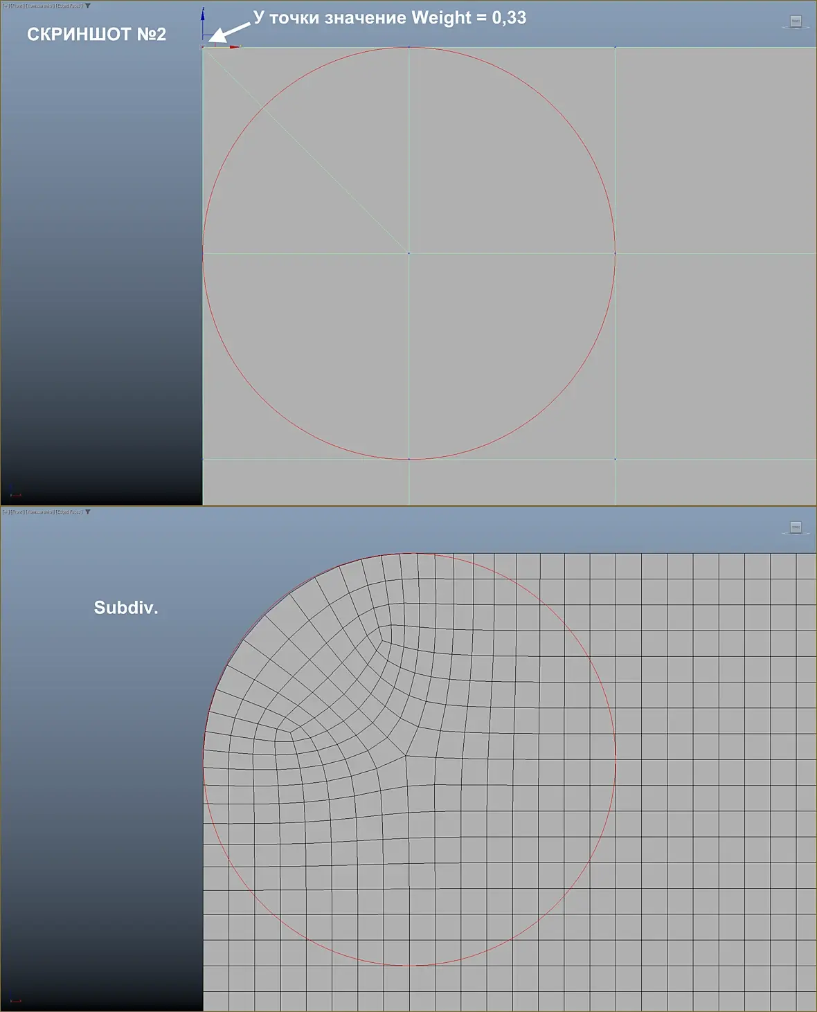 С топологией как на Скриншоте №2, намного ближе к истине, если у угловой точки в значении параметра Weight поставить 1/3 от изначальной единицы, т.е. 0,33. Но тут уже точки, от которых начинается скругление, начинают хоть немного, но разъезжаться без дополнительных поддерживающих рёбер. Да и форма радиуса всё равно не точно повторяет вспомогательный сплайн.