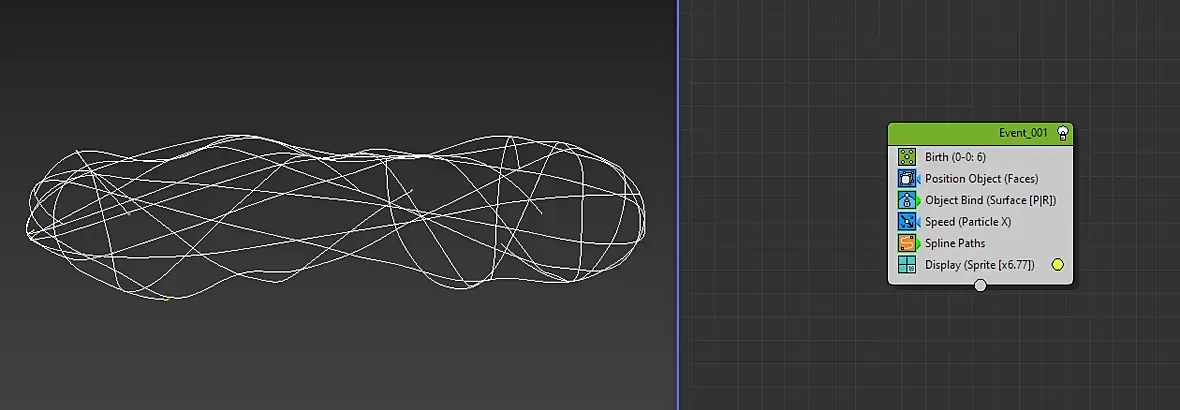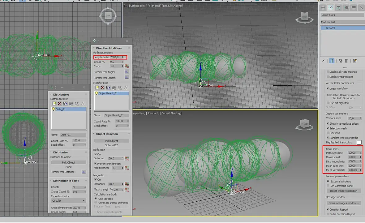 Т.к. я не знаю как спавнить дуги, я сделал прямые сплайны из ParticleBind, потом "надул" их по градиенту дисплейсментом, затем взял выделение через tyselect одного ребра с каждой бочки. Вот потом вообще засада, meshToSpline делает рваный сплайн, поэтому пришлось экспортировать через EditPoly, тем самым ломая всю процедурность...