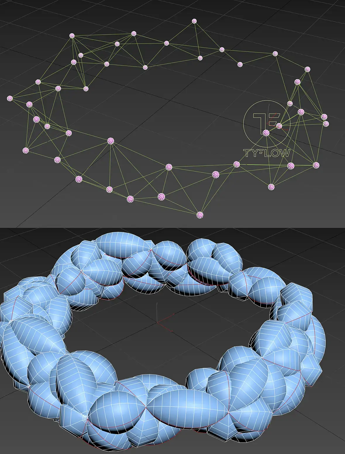 да такое лучше не показывать, костыльно и результата не выдает. Вам бы лучше найти скриптолога, который знает как заспавнить дуги между ближними точками или гудинщика или геонодами как-то...