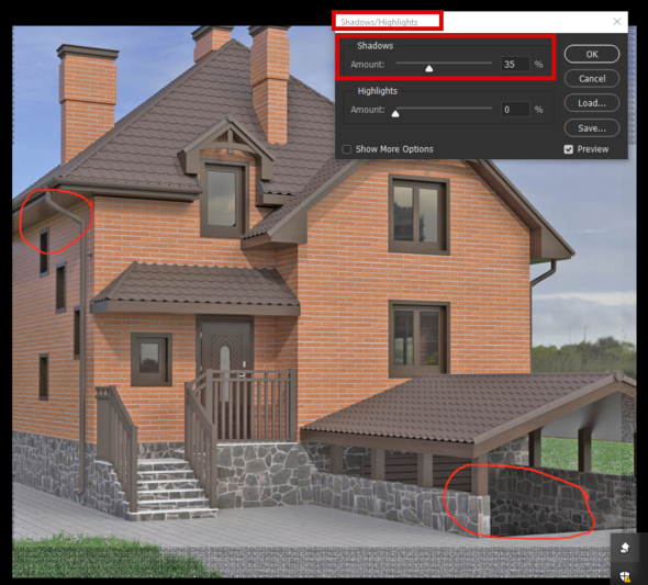 Наоборот у тебя в исходной картинке не хватает контраста в тенях в целом. А если уж где-то местами тени получаются слишком тёмные, то они легко по маске вытягиваются в фотошопе с помощью Levels.