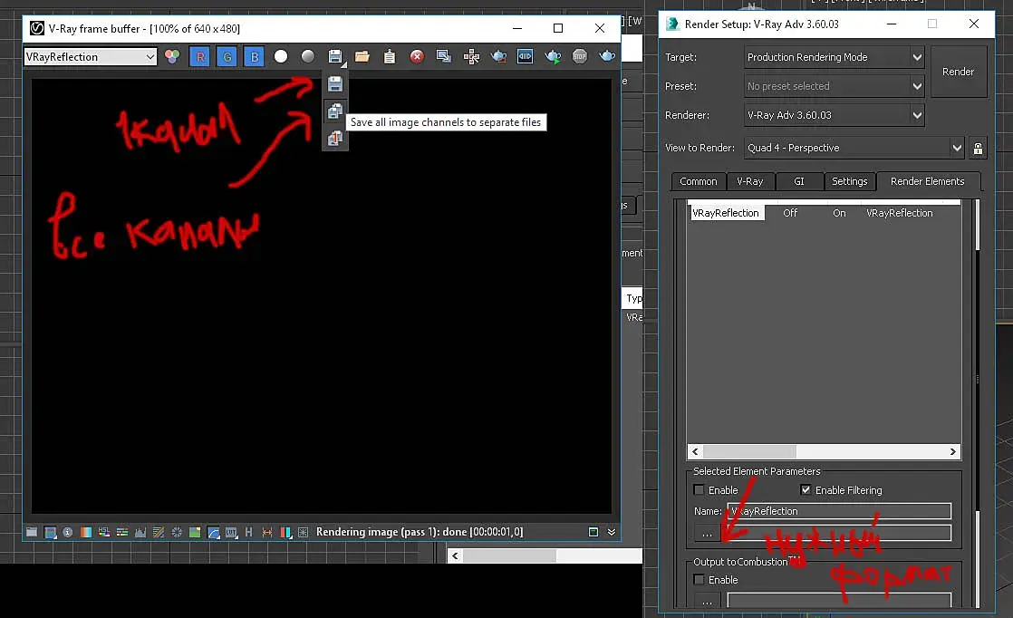 DizArtWork видите там на картинке красненькая стрелочка и надпись НУЖНЫЙ ФОРМАТ. Так вот это самое и не работает.  Я вас поздравняю с невероятным открытием как и Motocat. Попробуйте в рендер элементах прописать формат сохранения например exr. А в настройках виреевского фреймбуфера формат сохранения рендер элементов, что-то дугое, например, джерег. И посмотрите в каком формате у вас они сохранятся.  Можете даже попробовать ничего не прописывать в виреевском фреймбуфере, вдруг вам повезет. Только виреевкий фреймбуфер держите включенным, в этом весь смысл. Потом обязаетльно напишите здесь, что у Вас получилось. Буду ждать с нетерпением.
