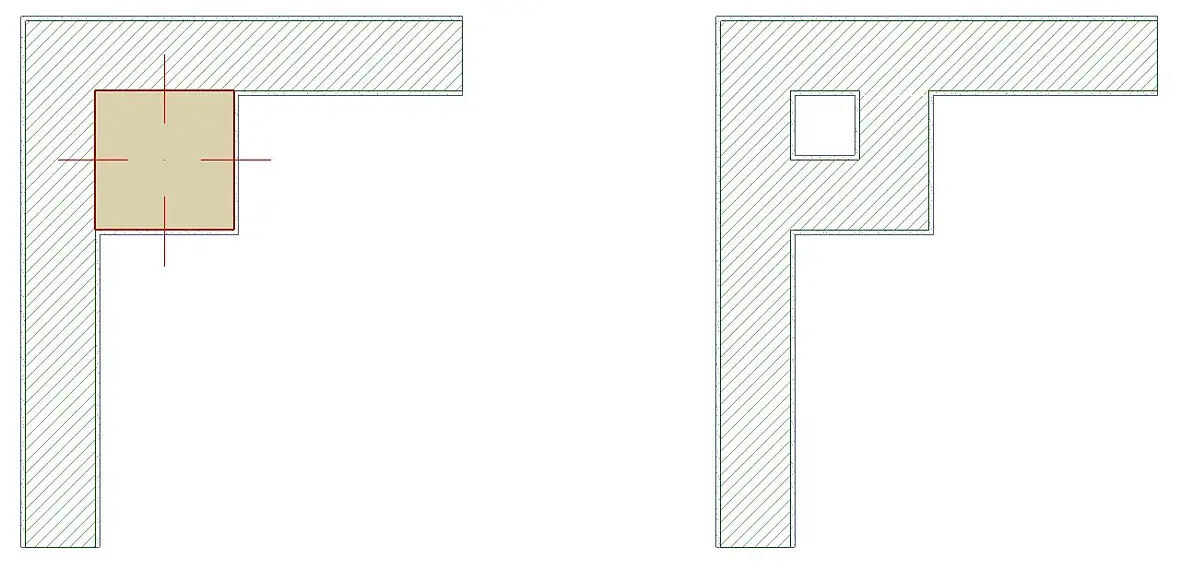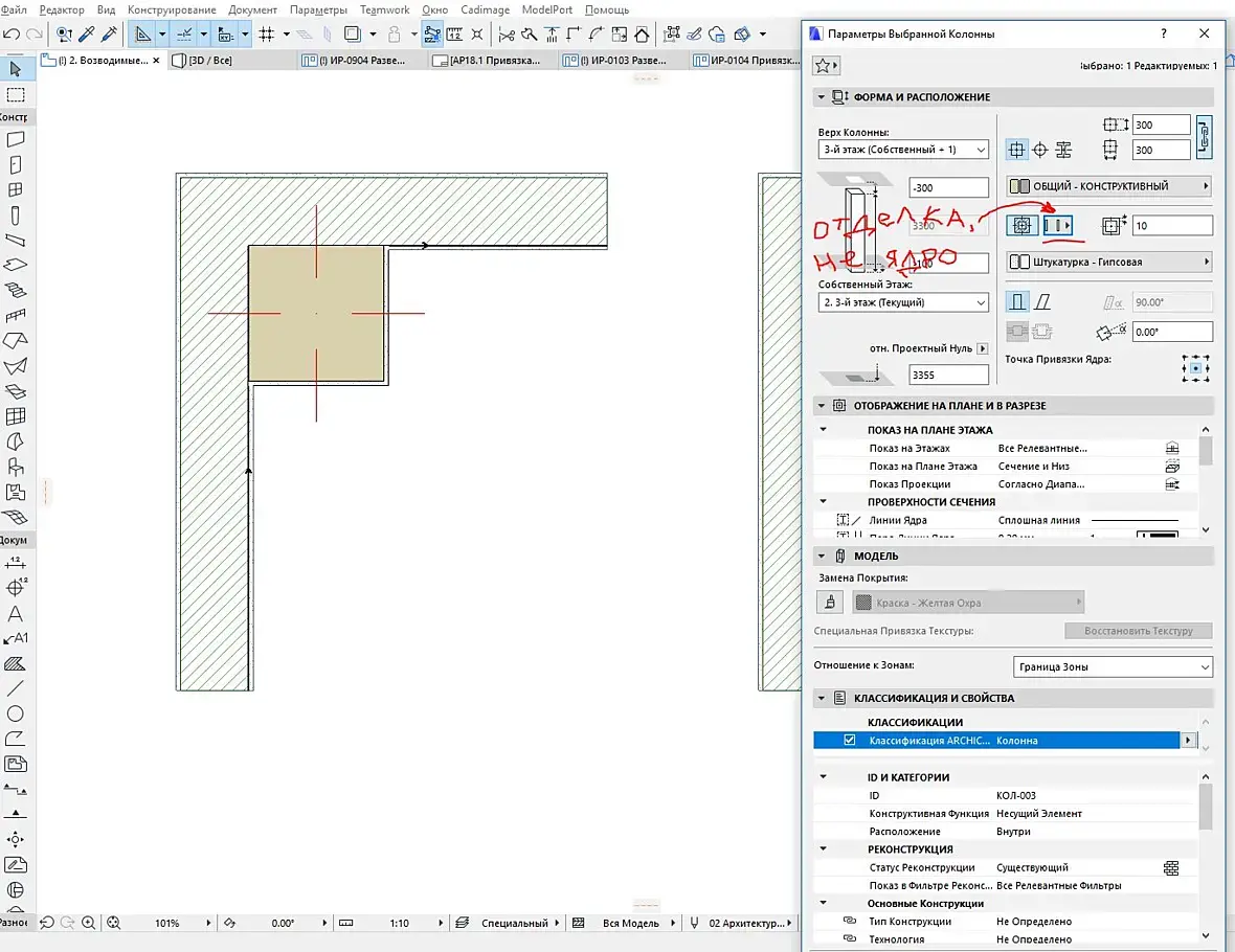 добавьте штукатурку на колонну, или сделайте стену из штукатурки, укажите что штукатурка это отделка, а не ядро