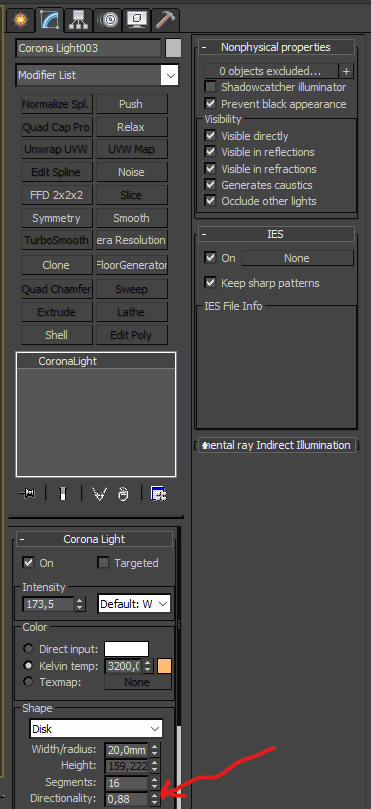 В реальных светильниках, на самом деле все немного сложнее, там стоит линза, которая фокусирует луч, поэтому вначале он толще а к концу сужается. У нас же просто точечный светильник, который наоборот, к концу луч немного расширяет. Подобного эффекта сужения луча, можно было бы добиться так же стеклянной линзой и каустикой, но это будет очень долго, шумно и малоэффективно. Можно попробовать сделать 2 или 3 луча с небольшим углом рассеивания, чтобы они начинались немного из разных точек и сходились в одну. Ну это если прямо хочется заморочиться