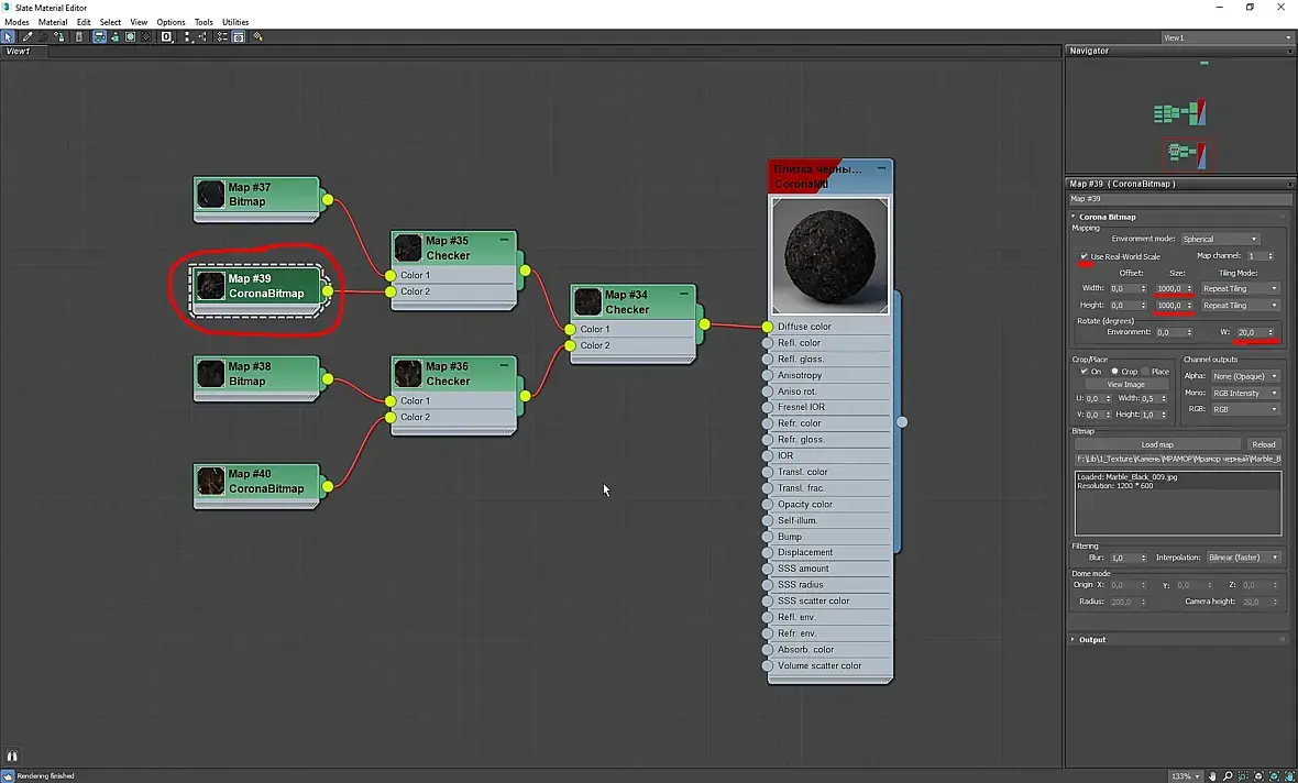 7. Теперь осталось добавить нашу текстуру мрамора: просто перетаскиваем ее из папки в окно редактора материалов, ставим галочку Real-World Scale, размер - 1000х1000 мм. Почему не 500? - Чтобы меньше повторялась, выглядела разнообразнее. Можно повернуть текстуру на определенный угол - на скрине 20 гр., опять же, чтобы меньше повторялась. (P.s. на скрине текстура в Corona Bitmap, в стандартном 3D-максовском битмапе - все тоже самое...):