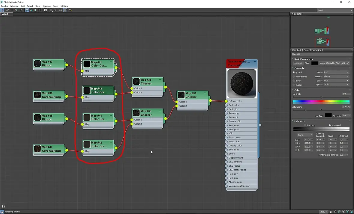 8. Исправляем это - просто добавляем между текстурами мрамора и картами Checker карты Color Corrections и корректируем - снижаем яркость, уменьшаем насыщенность.... в общем, до достижения приемлемого результата и душевной гармонии):
