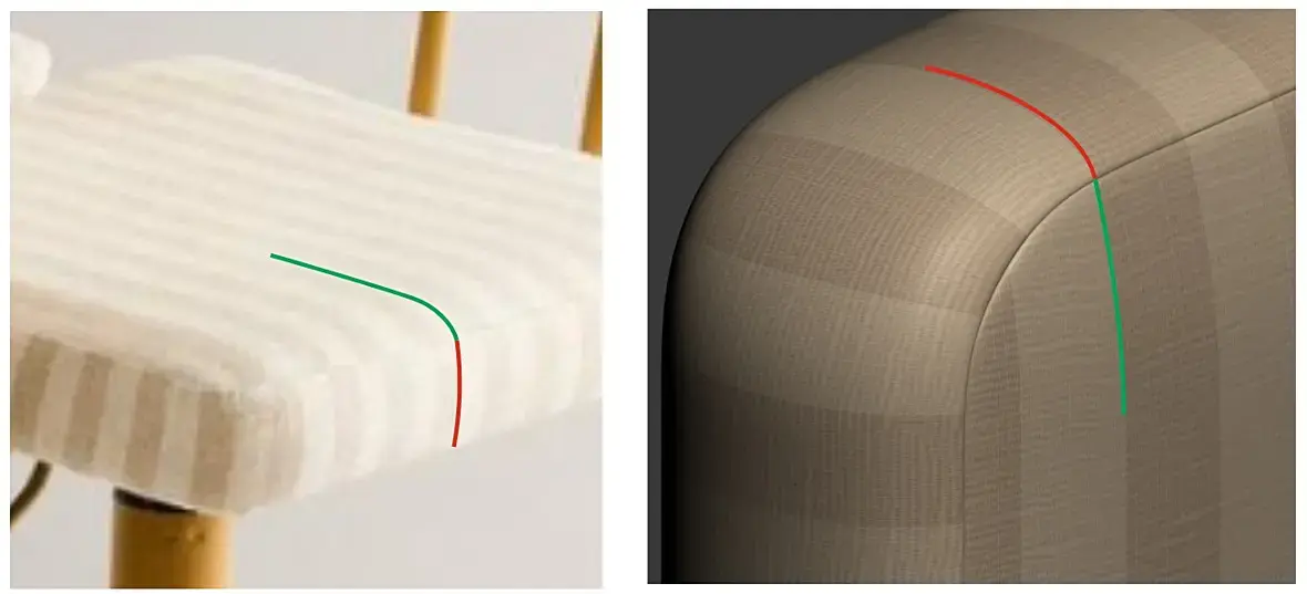 Всем привет! Делаю развёртку полосатого офисного кресла. Для меня это новая тема, поэтому пока сложно оценить правильность и качество UV. Везде пишут, что главный критерий — корректный checker, но именно с ним у меня проблемы: не могу убрать искажения на скруглённых углах подушки. Хороший результат получается только тогда, когда я начинаю искривлять линии в самой развёртке, но не уверена, что это допустимо. Также искажения пропадают после применения сглаживания (SDS). Подскажите, пожалуйста, как правильно решить эту задачу и в верном ли направлении я вообще двигаюсь?