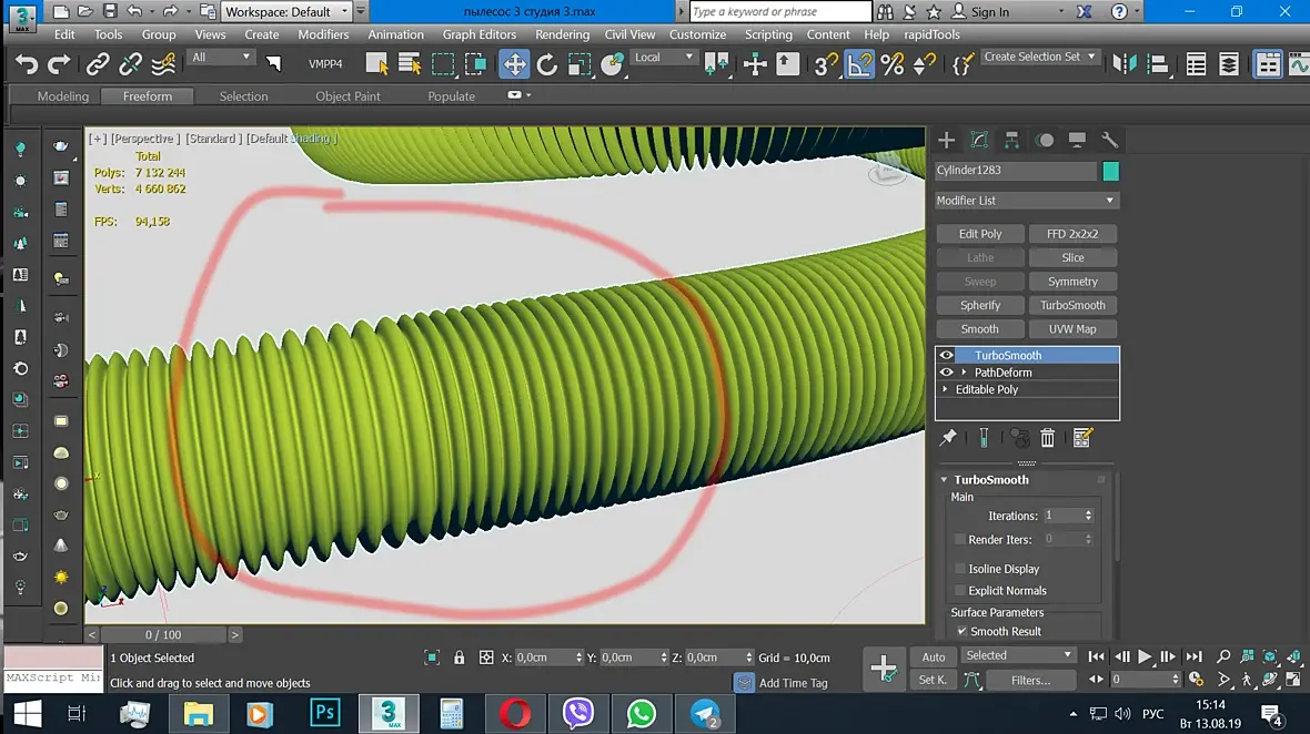 Сплайн по которому у вас шланг деформируется отредактируйте. Нужно чтоб точки через равные промежутки располагались. модификатор Normalize.spl примените к линии
