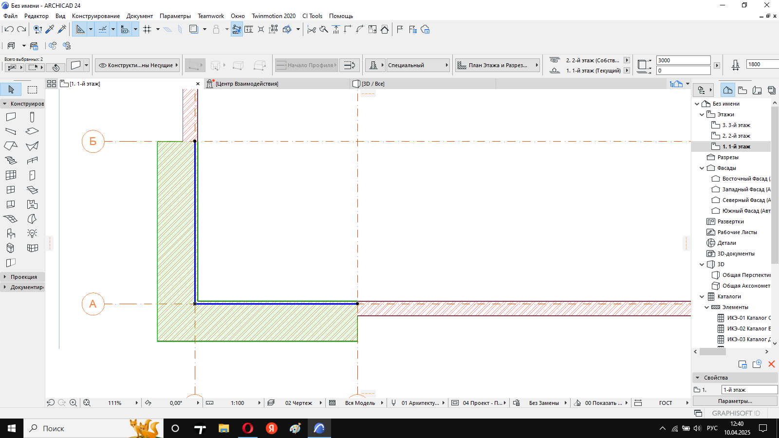 День добрый! Подскажите, пожалуйста, что сделать, чтобы эти перпендикулярные стены не стыковались в угол, а заканчивались на осях? (А-Б и 1-2)