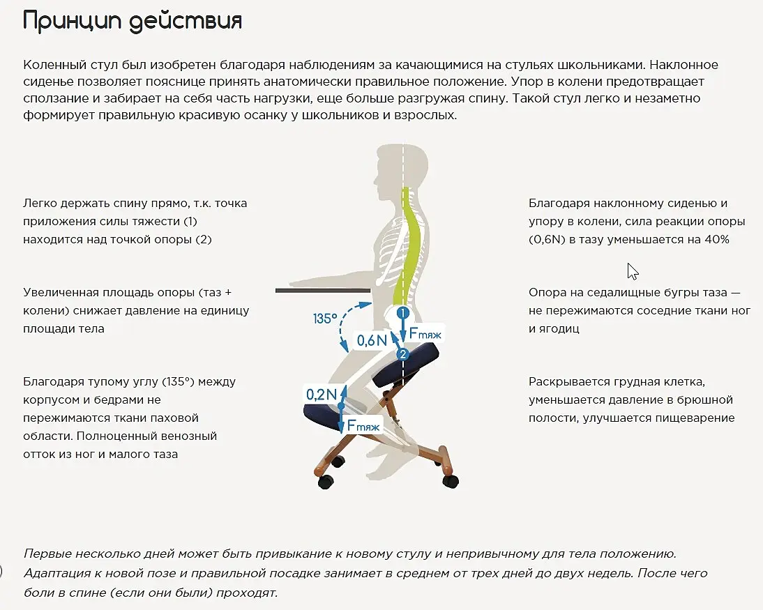 Производитель обещает, что благодаря правильной и естественной посадке застоя, наклону сидушки в малом тазу не происходит, спина перестаёт болеть.
