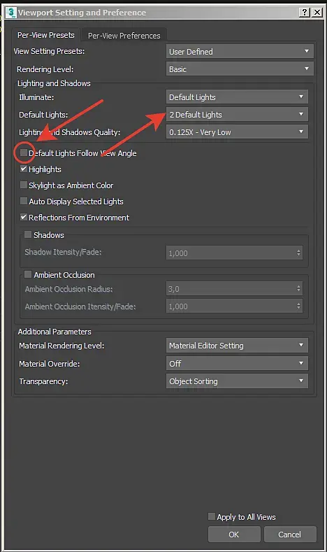 Нашел, что настройки отображения вьюпорта находятся в Views/Viewport Per- View Settings,Но как бы я не пробовал настроить свет, затемнение на объекте под определенным углом не исчезает.Может кто знает решение этой задачки?