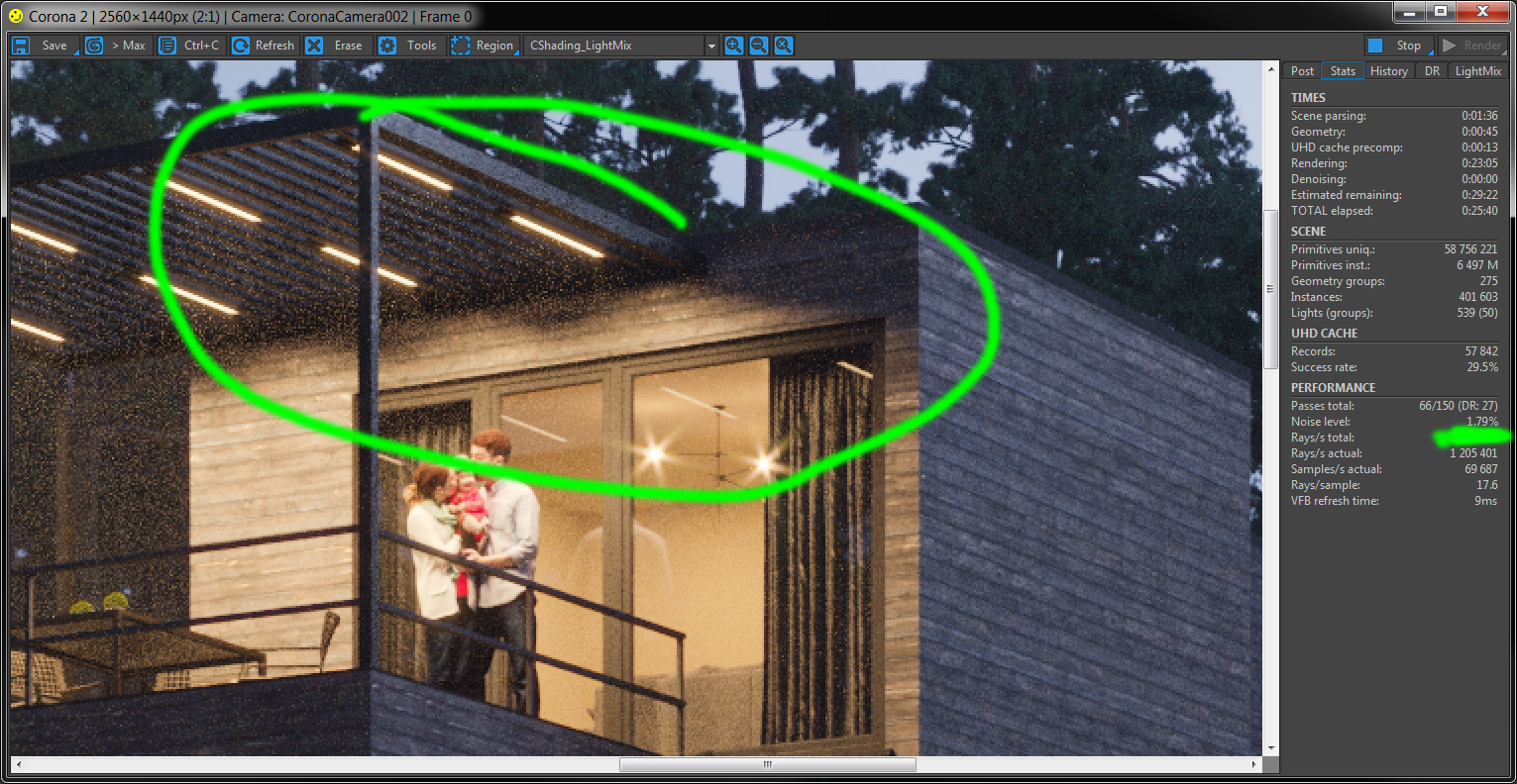 Ну вот вчера сцену рендерил на 1.7.4 ограничение по уровню шума -6%, для превью. Было 7 минут, стало 13)