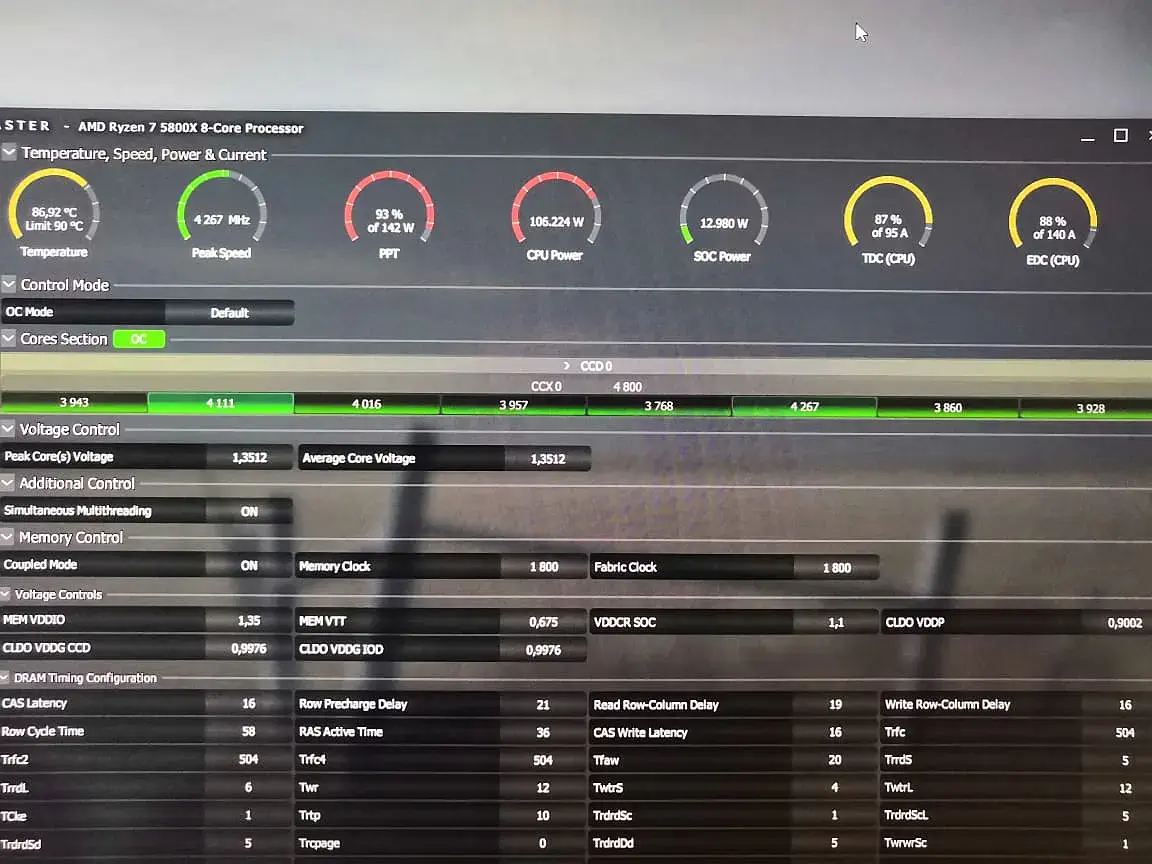 У меня при комнатной в 16 градусов 5900Х в разгоне до 4.5ггц греется до ~75 градусов на NH-D15 в хорошо продуваемом корпусе. А тут 5800Х на ~4.3ггц (судя по скриншоту с HWInfo64) и уже 86... Даже с учетом вольтажа с запасом накинутого все равно многовато. Ну и в итоге я бы все же попробовал через пару дней как выйдет CTR 2 - настроить частоту и вольтаж через него в авто режиме. За одно и LLC подберете с помощью CTR... Если даже так будет нагрев около 80 градусов, то тут явно чет не то с охлаждением.