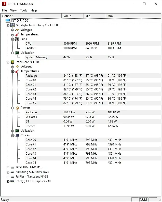 Intell Core i5-11400 @ 4191MHz по всем ядрам / BOX куллер