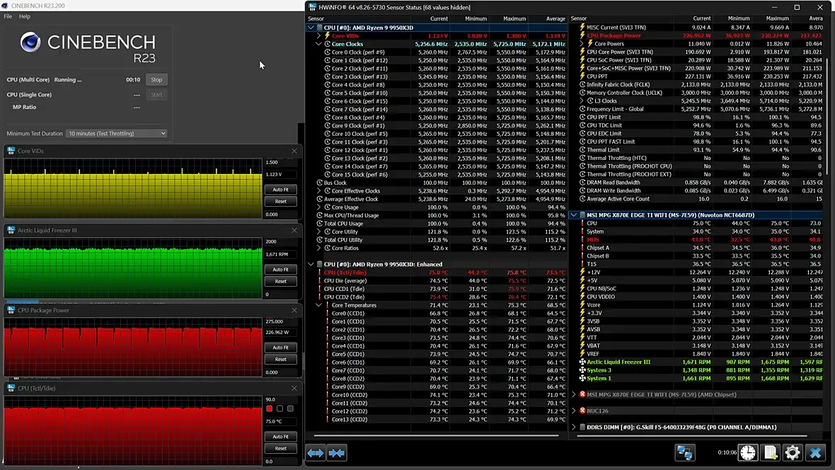 Если кому для пристрелки по VID-ам/Частотам/PPT/Температурам нужны будут какие нить данные. Вот 10-ти минутный стресс тест CBR23 при 21с комнатной, на открытом стенде с Arctic Liquid Freezer III 420 на проце. С настроенным Curve Optimizer в -30 CO + -25CO и PBO на 230PPT/180TDC/225 EDC, Scalar x1, fMAX = 0 (я подумал что в играх и так все хорошо и выжимать еще fMAX в +100-200, ну куда уж).