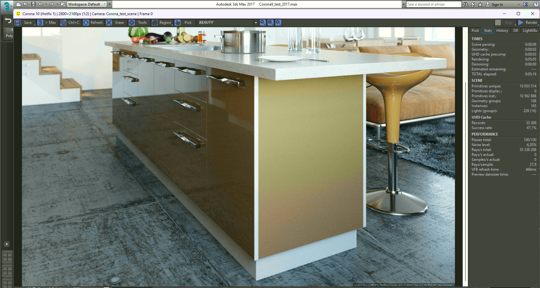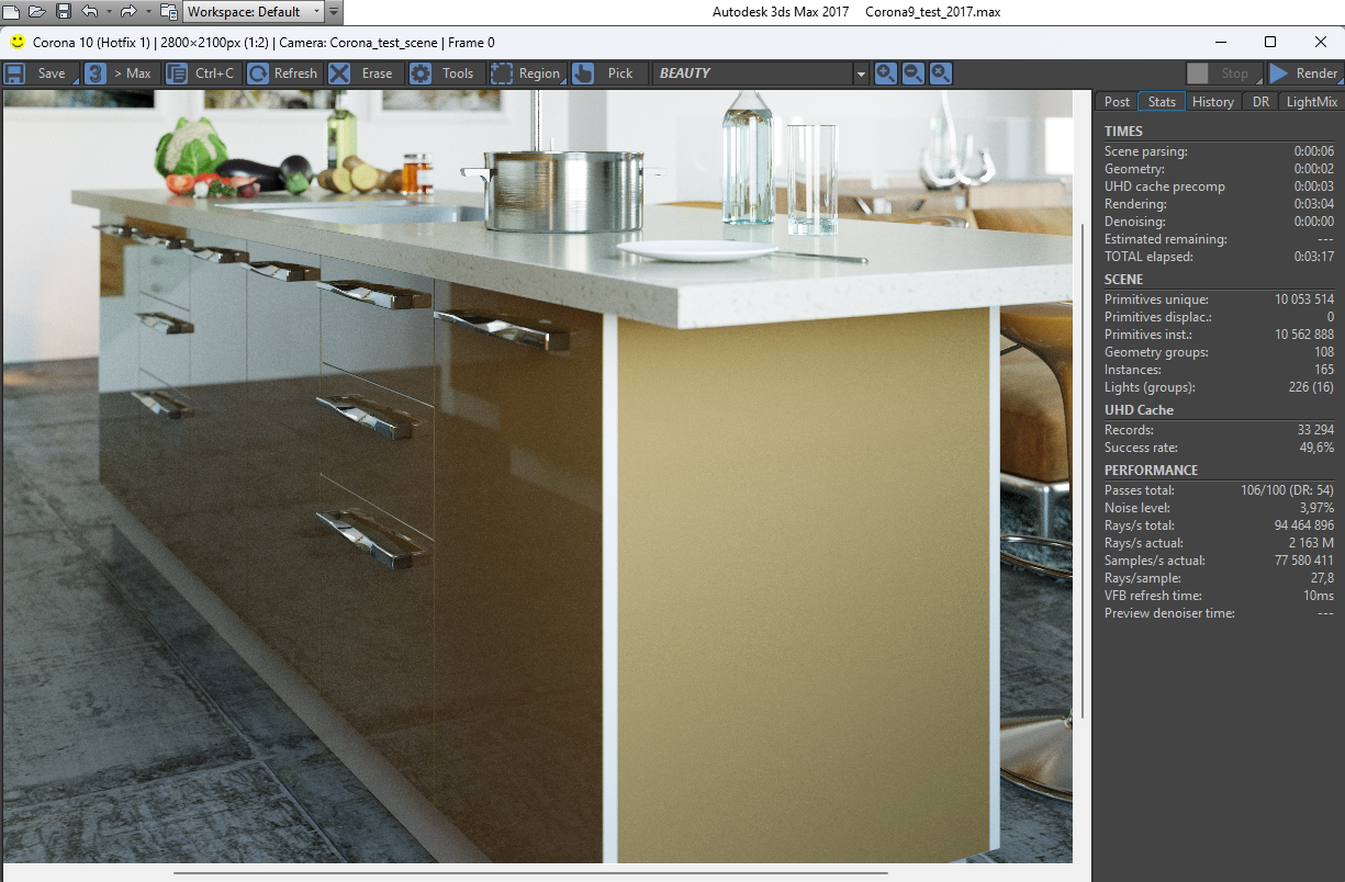 Для того чтобы точно оценить время рендера на вашем(их) процессоре(ах) - используйте подходящую версию сцены, версию Короны и версию Макса начиная с 2017го!
