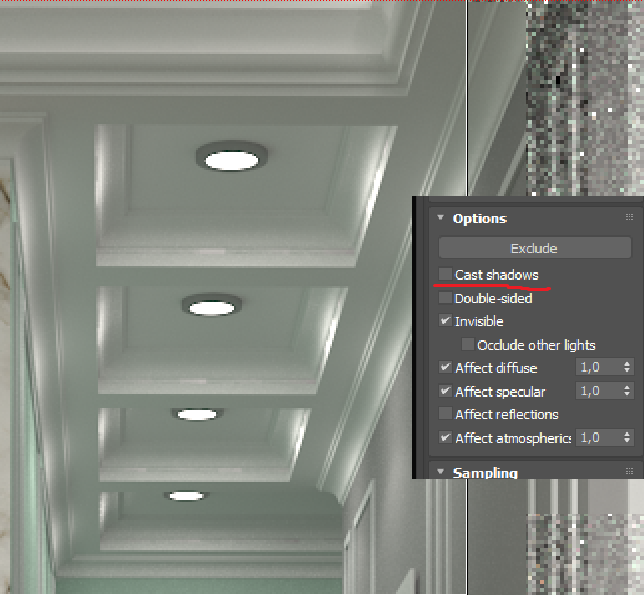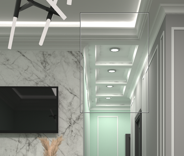 2. Если пятна не ушли, тогда удаляем карниз оставив просто нишу. Если пятна ушли, значит криво сделали карниз и тут надо смотреть на группы сглаживания или просто переделать снова. Если пятна остались значит надо крутить настройки рендера.