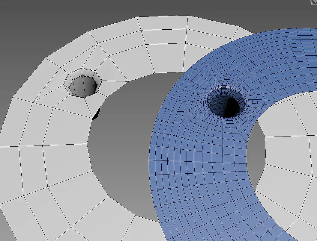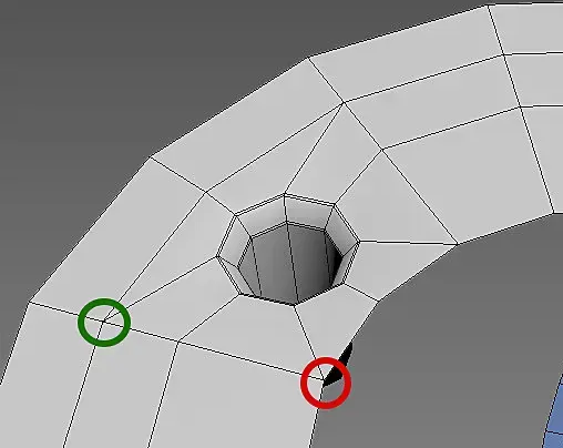 Но, если модель пойдет в геймдев, тогда дополнительная грань по кругу может стоить слишком дорого по полигонажу. В таком случае где красным нормально, а где зеленым уже нет. Потребуется удалить всю опоясывающую грань, а узел завести к краю.