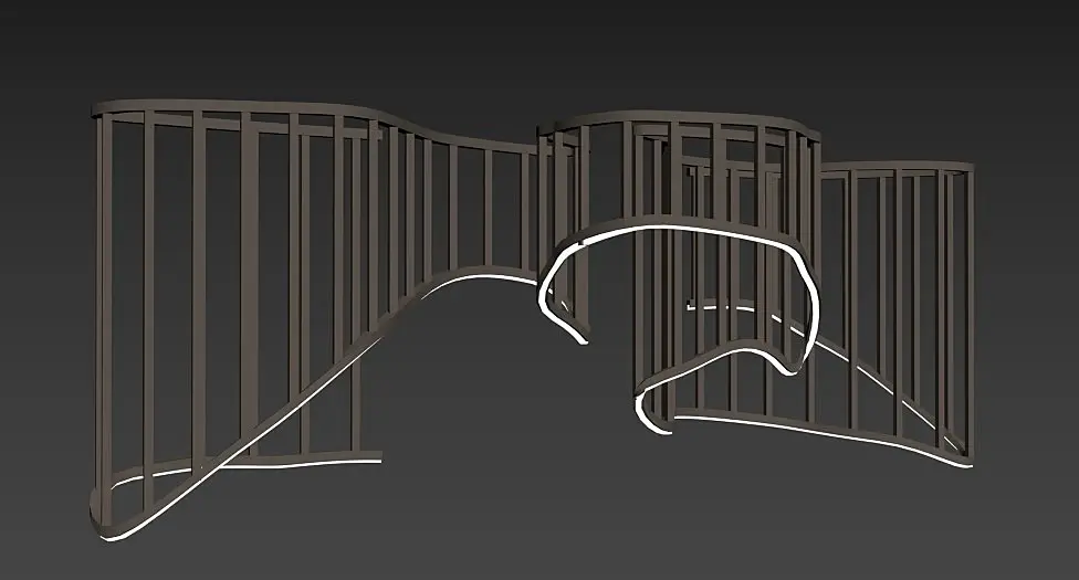 Как вариант, комбинацией Shift+I раскидываем вертикальные палки по сплайну-пути с высотами, подрезаем slice верхушку, чтобы верх был в один уровень