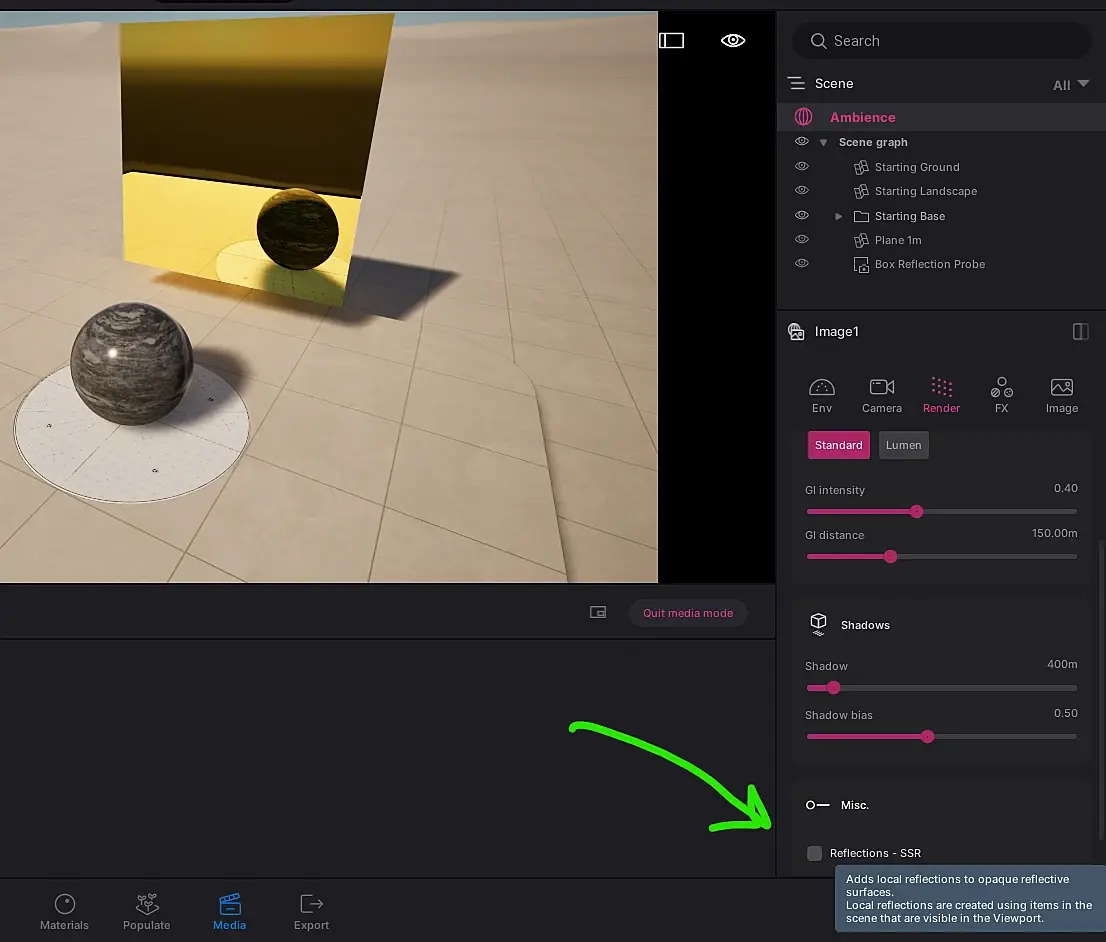 Размер и яркость и т.д. настроить в свойствах Probe. Не забывать про кнопку "обновить". Качество отражения Probes можно изменить в настройках, там же можно поставить галку на автообновление отражений при экспорте.