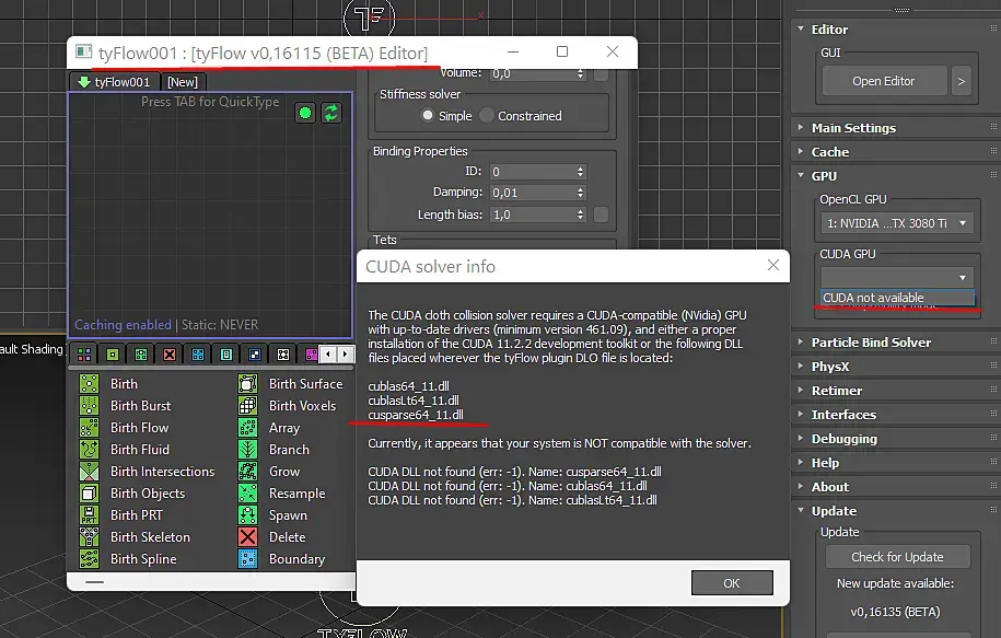 Не поверите, сегодня столкнулся с той же ситуёвиной) только установил BETA версию 0,16115, где всё работать должно, но на моей 3080TI CUDA не работают, т.к. TyFlow не может найти 3 dll, я так огорчился и даже нашёл переписку разраба с пользователем у которого тоже 3080, и кароч не работает (пробовал и на студийных дровах и на игровых) вот переписка https://forum.tyflow.com/thread-2266-post-7559.html у кого ниже 30 серии всё норм