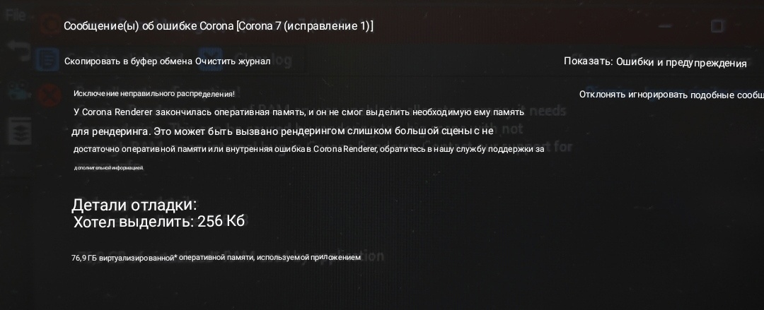 Помогите пожалуйста, что с этим делать? выходит ошибка : У corona render закончилась оперативная память и он не смогу выделить необходимую ему память для рендера. Оперативки 32 гб, сцена только прихожая. Специально закинула ее в чистую сцену без остальных комнат. но все равно все вылетает