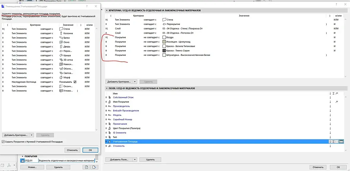 Как ни крутил "Учитывание площади по критериям" , ничего не помогает. Как считает он теперь 2 покрытия, так и продолжает считать, хотя я ему четко задал в критериях "Покрытие наружной поверхности " совпадает с _______. Как быть?