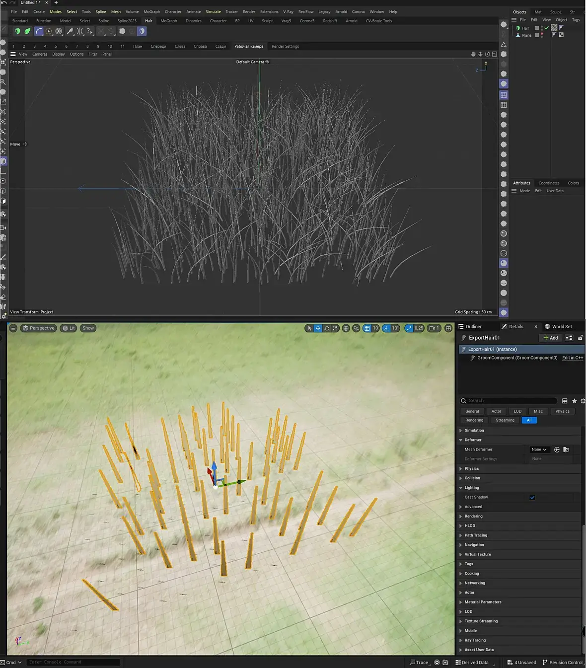 Здравствуйте, уважаемые! Вопрос за Hair в Unreal 5.2. Включил плагины, экспортировал Hair. И не сказать, что бы не получилось. Экспорт прошел. Но вот только гуща сильно поредела, в сравнении с исходником. В свойствах объекта в Unreal ни где это не регулируется. Только толщина. Как так?