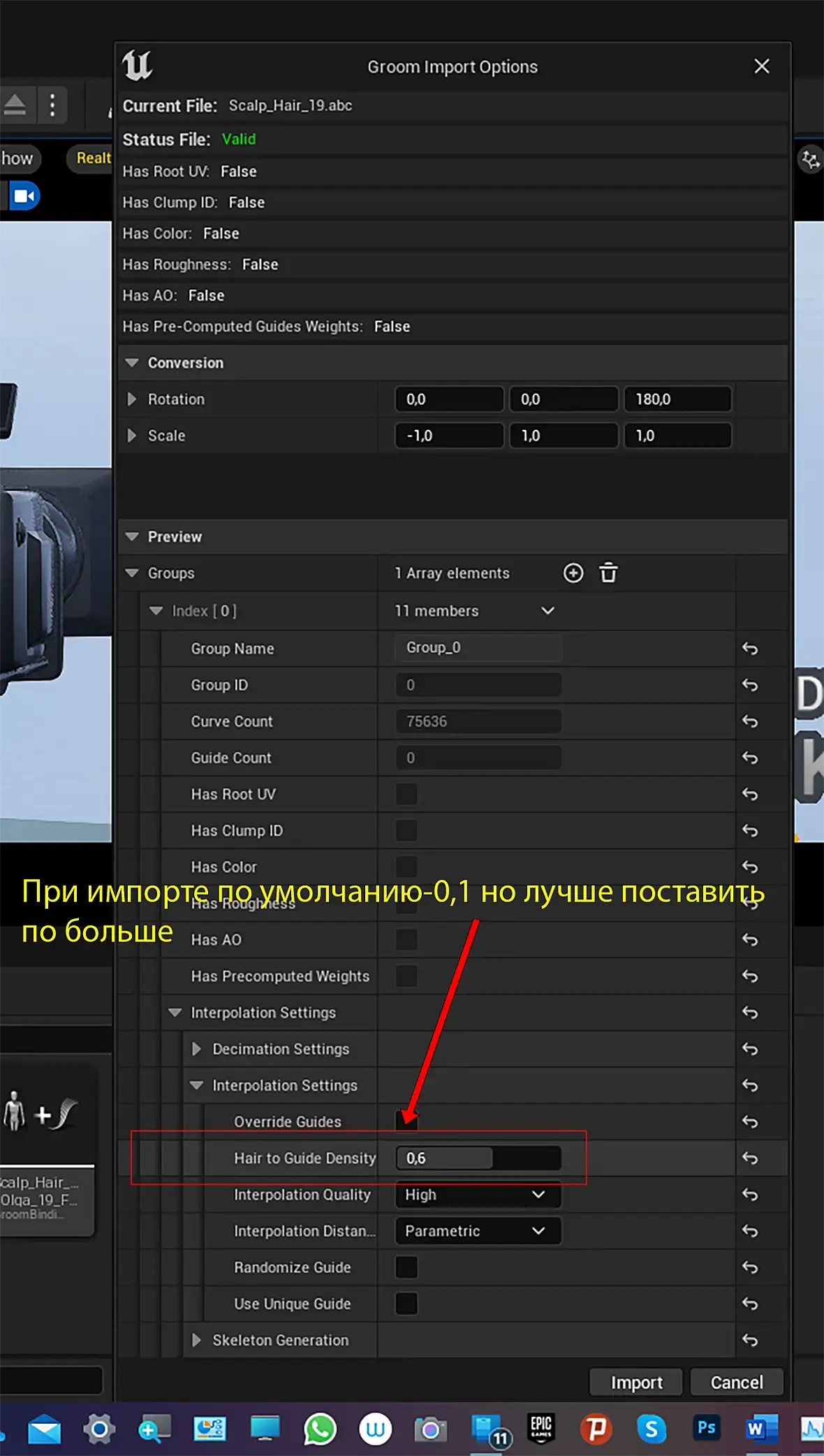 Здравствуйте, уважаемые! Вопрос за Hair в Unreal 5.2. Включил плагины, экспортировал Hair. И не сказать, что бы не получилось. Экспорт прошел. Но вот только гуща сильно поредела, в сравнении с исходником. В свойствах объекта в Unreal ни где это не регулируется. Только толщина. Как так?