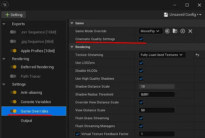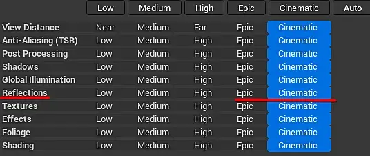 hunger, наверное имелось ввиду качество графики в Вьюпорте. Ведь High Quality отражения в Люмене работают только на Epic/Cinematic пресете. Точнее когда Reflections стоят на Epic/Cinematic. Но если вы используете MRQ то скорее всего добавляете туда пункт Game Override с Синематик качеством так что это наверное не тот случай.