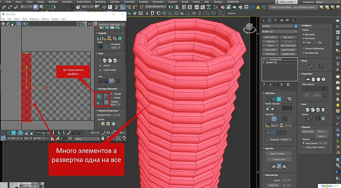 Там нечего растаскивать, нет кластеров. Это иногда полезно, когда хочется единую развертку на куче одинаковых элементов. Это не глюк, а вполне валидная фича анврапа. Вручную это можно сделать через Edit: Copy - Paste Weld.