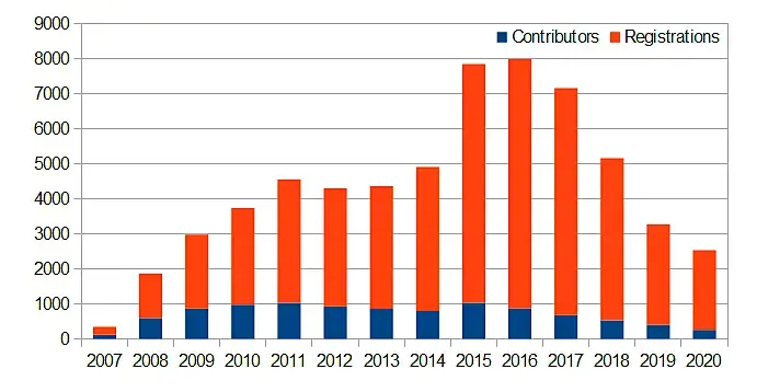 Оранжевые это новые юзеры за год. Синенькие это та часть юзеров, кто залил хотя бы одну модель...