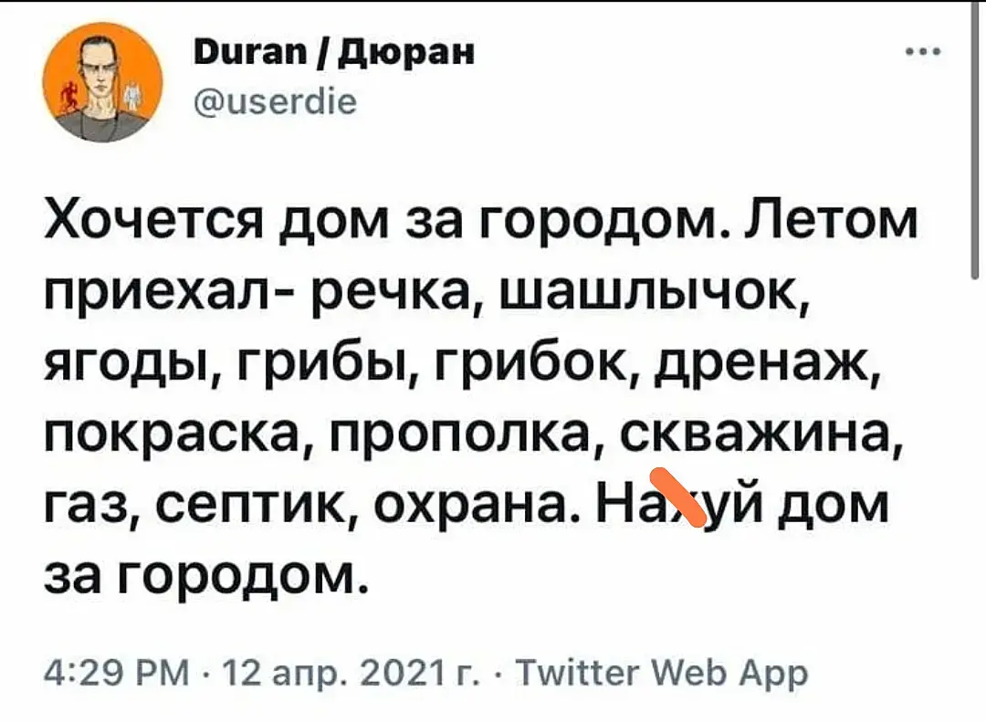 Yehat, у меня дядя охотолюб, купил с напарником домину огромную 200 км от Екб в глухомани лет 8 назад - всего за 100 000 руб (перевалочный пункт - охотничий типа домик). стены - брёвна толстенные, баня, сарай, стайки, погреб, всё кондовое на сотню и больше лет хватит. Ничего там нет - ни грибка ни покраски. Это пишут долбоящеры которые за городом видели лишь лубочные нищедомики со старушками. Есть конечно разные. Но тут уже от хози зависит - если конуру состряпал - ну сам такой :-) Охрана - соседи. Прополки - ноль. У нас - за городом Екб уже более цивилизованная местность тоже не сильно упарываются за это всё...