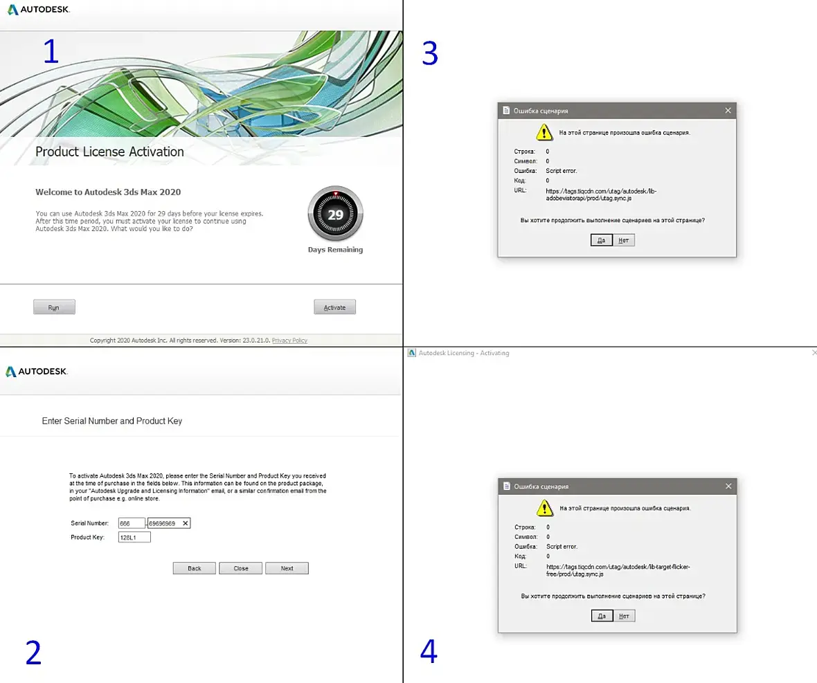 При установке скаченного с торрента 3dsmax 2020 на этапе активация появляются ошибки сценария с такими урлами: