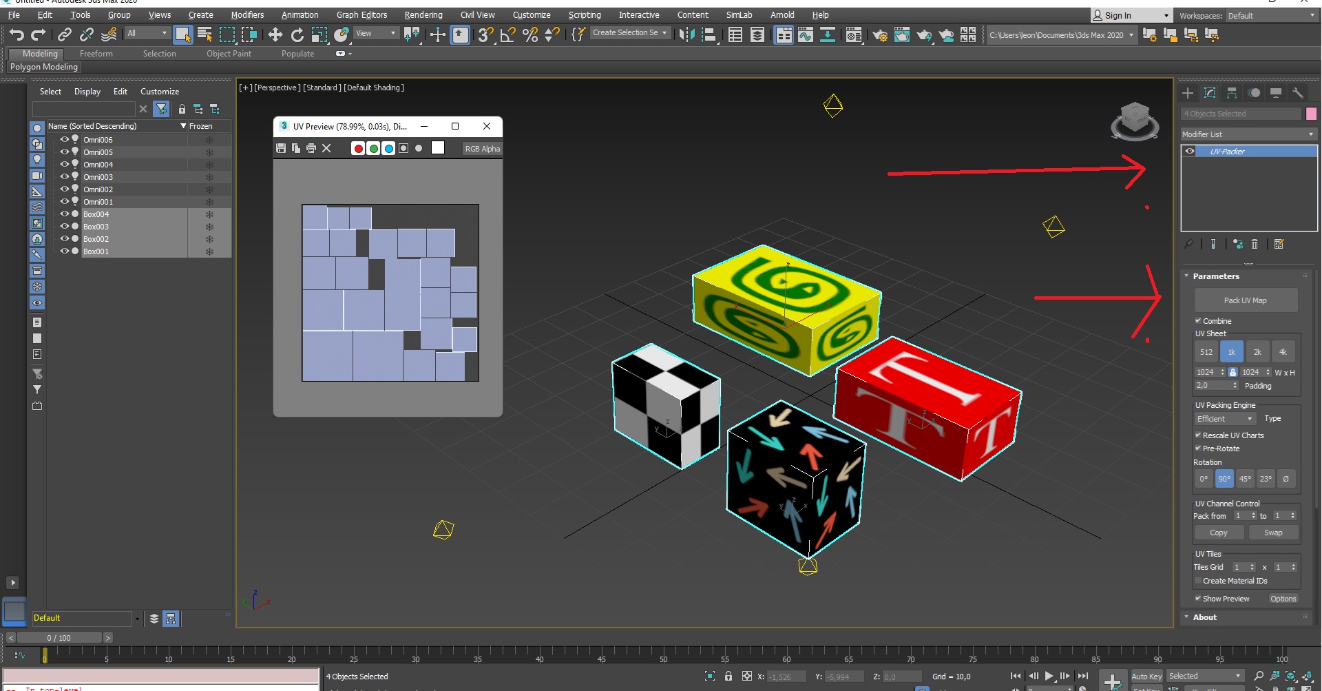 на втором скрине применяю модификатор UV-Packer но в место красивых картинок появляются синие квадраты :(