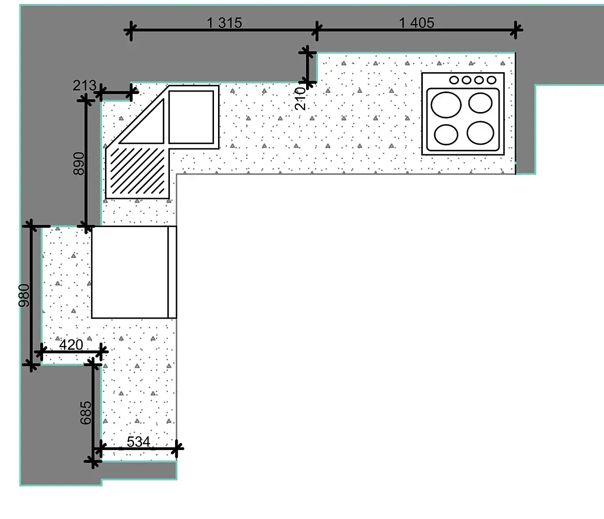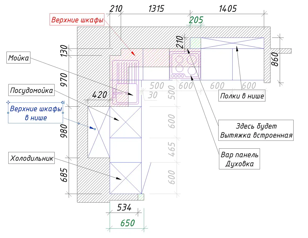 Извиняюсь за кривые почеркушки, я бы думала в какую-то такую сторону, если планировка позволяет. Ну только высокие модули в верхнем правом углу слишком уж глубокие получаются, рукой будет сложно достать. Либо зашить за ними, чтобы фасады модулей были вровень с кухней, либо "утопить" их относительно фасадов остальной части кухни. Конечно рабочей поверхности маловато и цикл нарушен, но плюсы у такой планировки тоже есть.