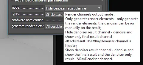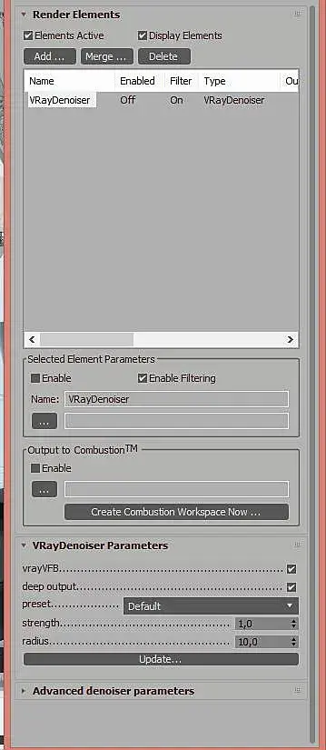Присоеденяюсь к проблеме описанной автором поста. После просчета рендера, VRayDenoiser не срабатывает. В окне VFB этот элемент не отображается. У меня добавлено 2 рендер элемента VRayRenderID и VRayDenoiser. Так вот VRayRenderID появляется, а тот нет. Включение галочек на Enable "включение сохранения в прописаный путь" ситацию не меняет. Кто то знает с чем это связано и что делать?