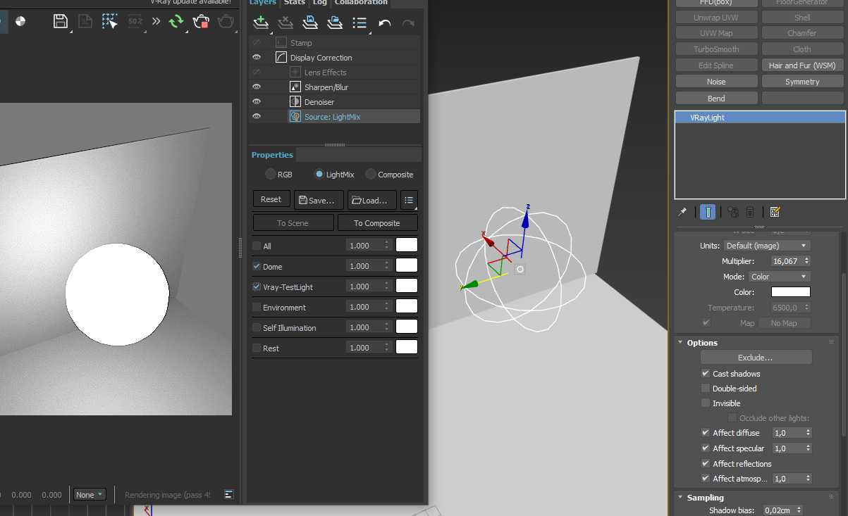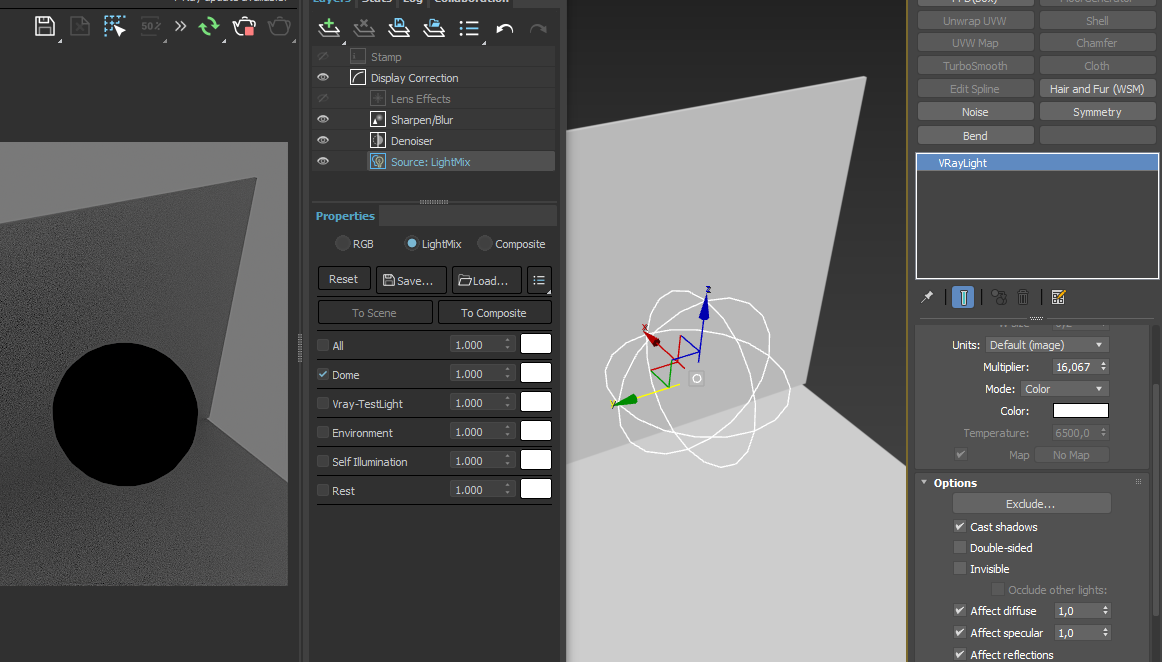 Здравствуйте! Я недавно перешел с Corona на V-ray ( GPU 6) и у меня есть один вопрос. Когда я создаю источник света в лампе, мне необходимо чтобы он светился когда он включен в VFB в LightMIx и его не должно быть видно когда он выключен в VFB в LightMIx. Это важно для меня. Я не хочу включать режим Invisible в настройках источника света а также не хочу использовать Light Material .Когда я выключаю источник в VFB при рендере, то получаю черное пятно вместо источника света. Я не хочу чтобы это пятно было видно когда источник отключен в LightMIx при рендере. В Корона я мог решить эту проблема просто выключив опцию Occluded Other Lights. В Vray я не могу это сделать потому что эта опция работает только вместе с опцией Invisible.